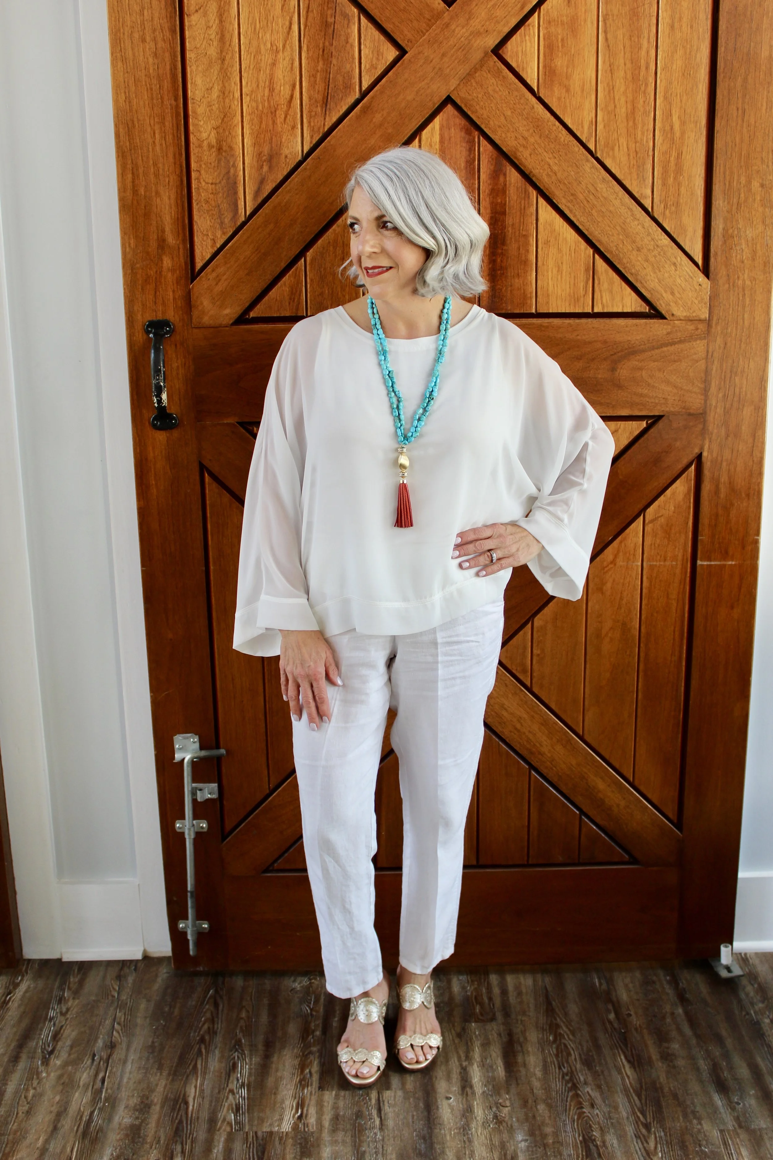 To start, my suggestion would be to think about what you like and your wardrobe. Then find a basic necklace, you like. I’m partial to the gold and silver one and the turquoise. Then add a few different tassels, tags or centerpieces. Just one necklace can give you numerous, unique looks. And if you travel, it is so easy to take a couple of pieces and change up your look. Even my black and white outfits, provide for different looks as a result of this beautiful jewelry. And the bonus is that never has jewelry been so easy to put on, and take off!